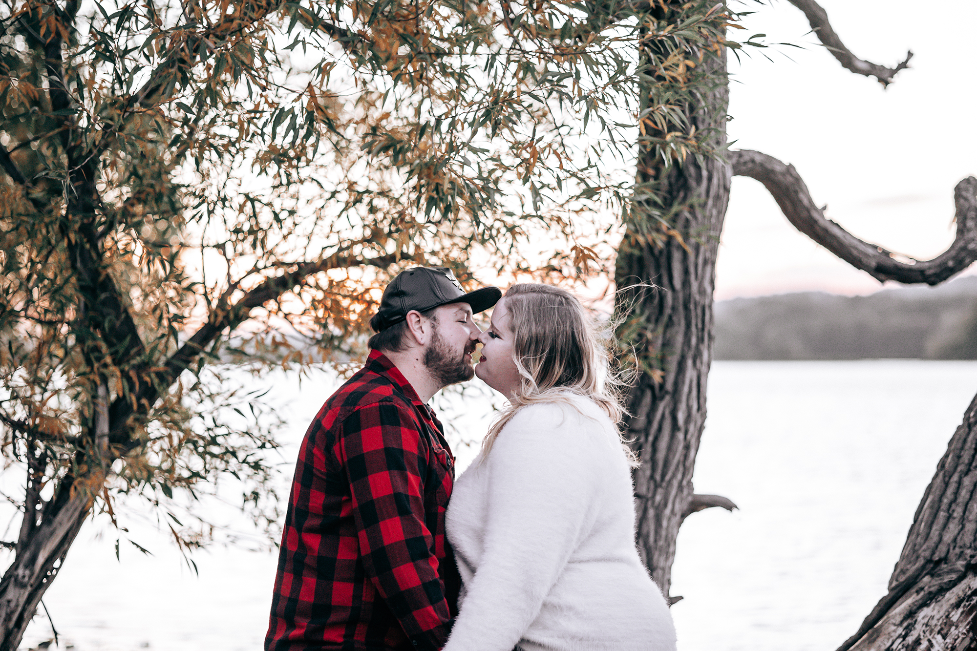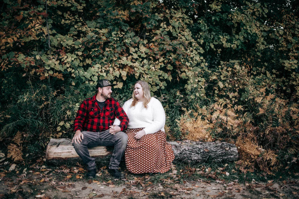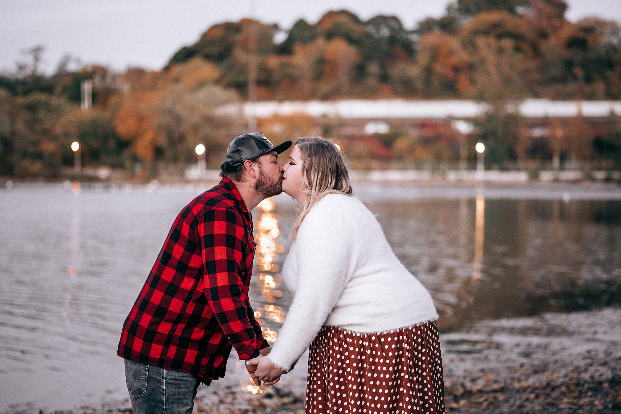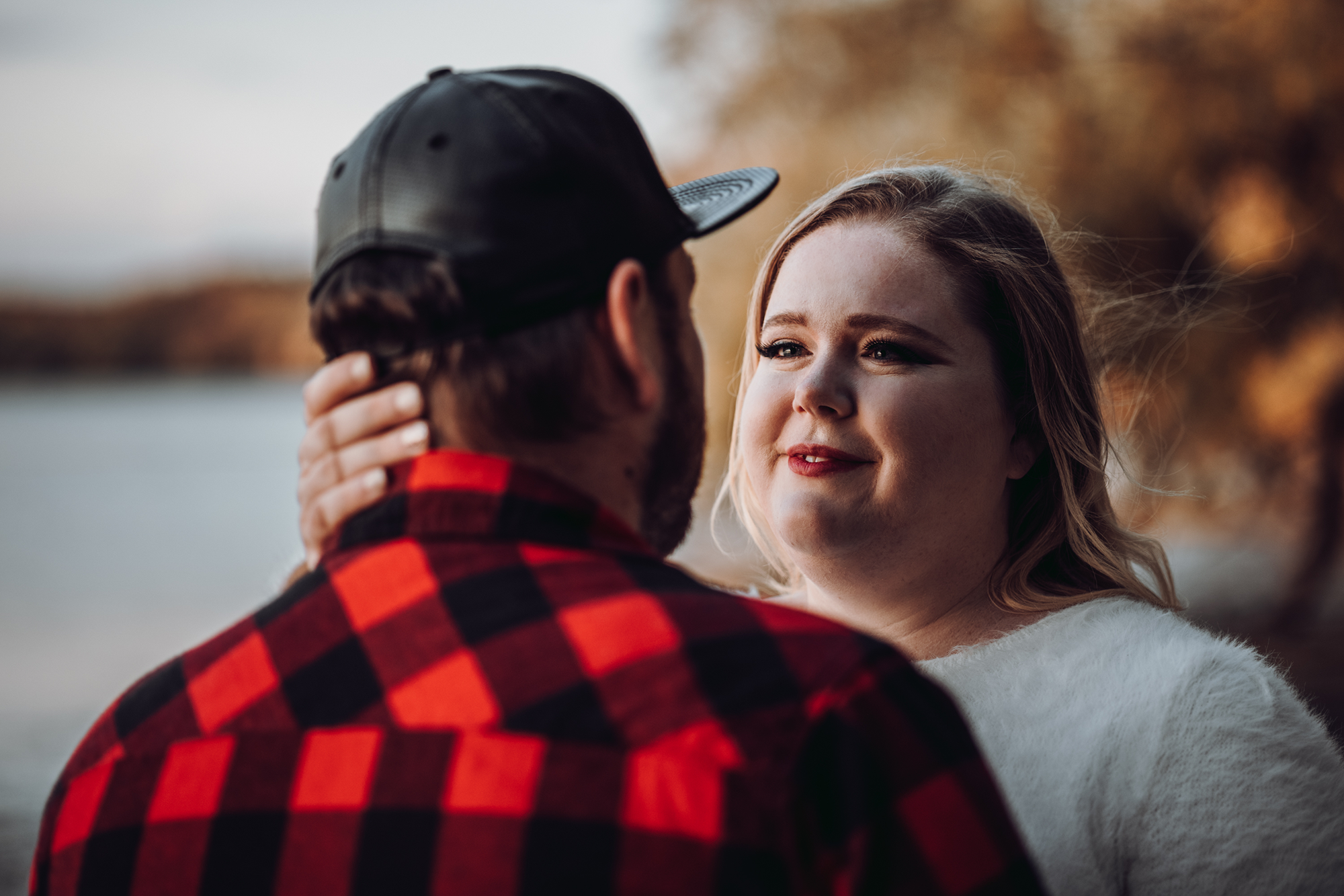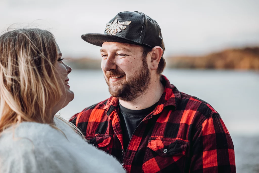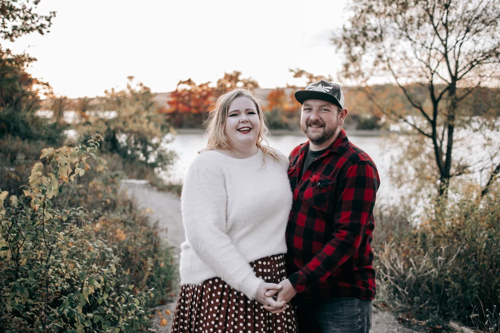Their session took place in the fall, when the forest was glowing with golden leaves and warm sunset colours. Golden light filtered through the trees, the water reflected the sky, and the quiet trails created the perfect setting for capturing natural moments between two people deeply in love.