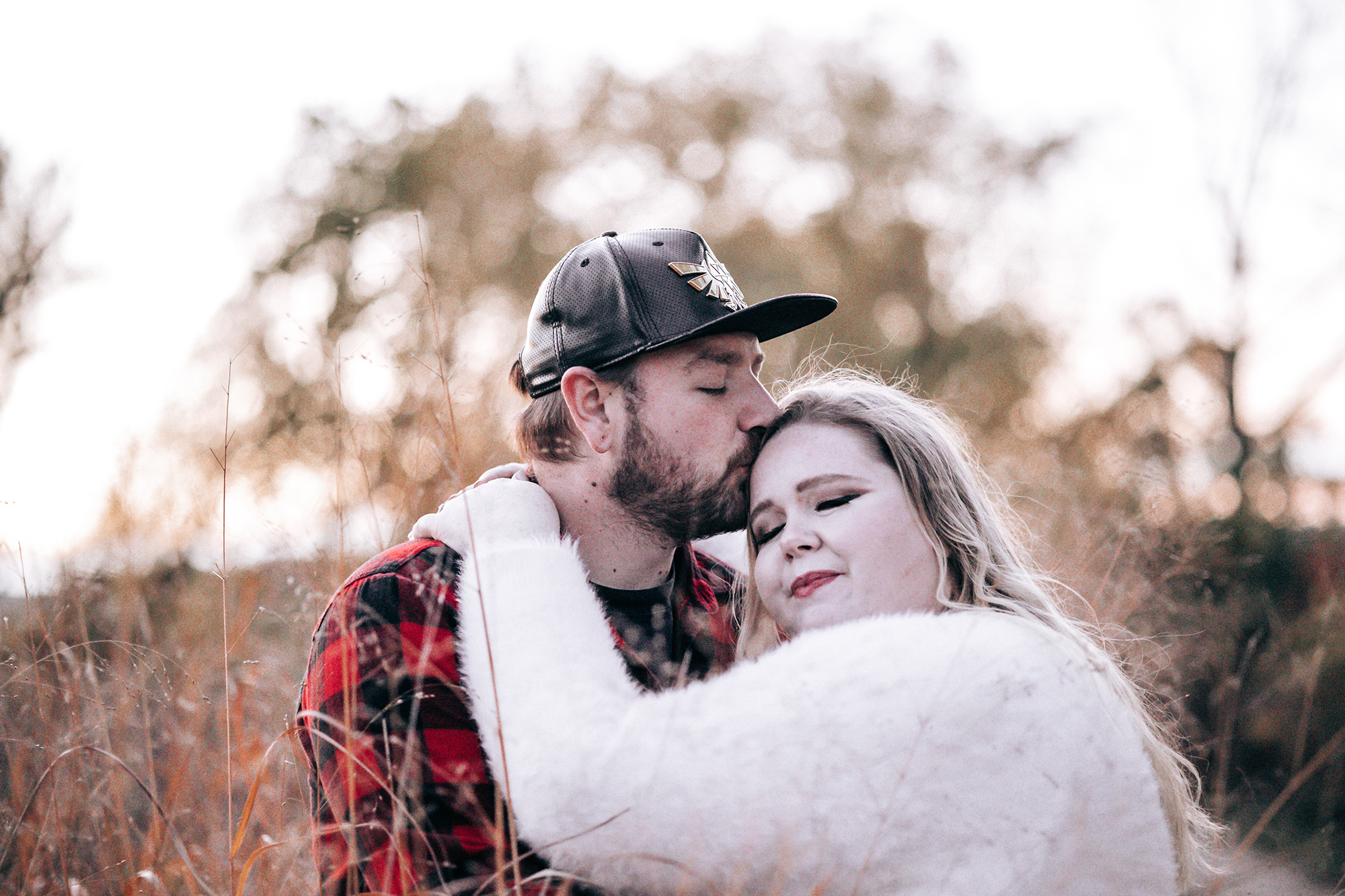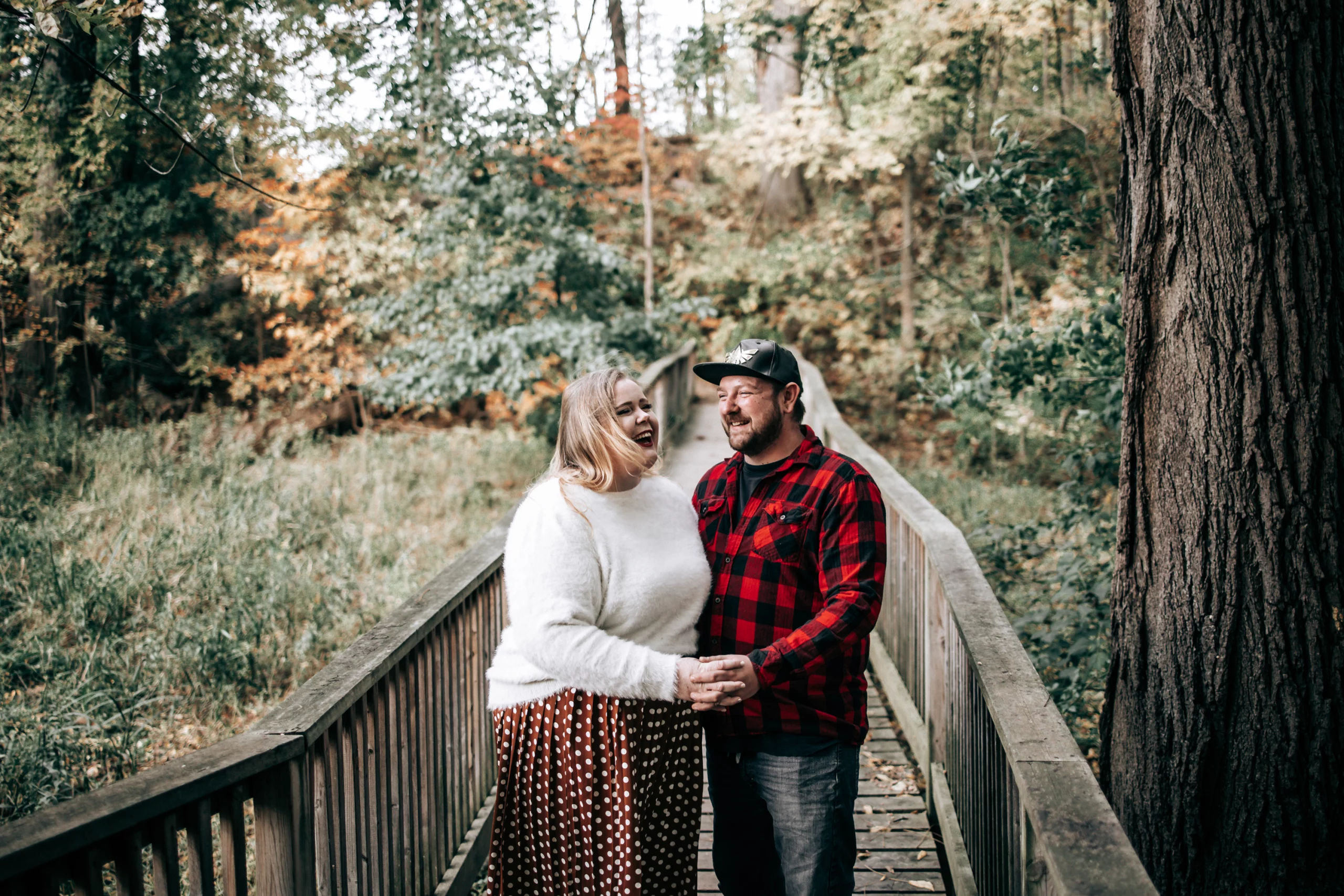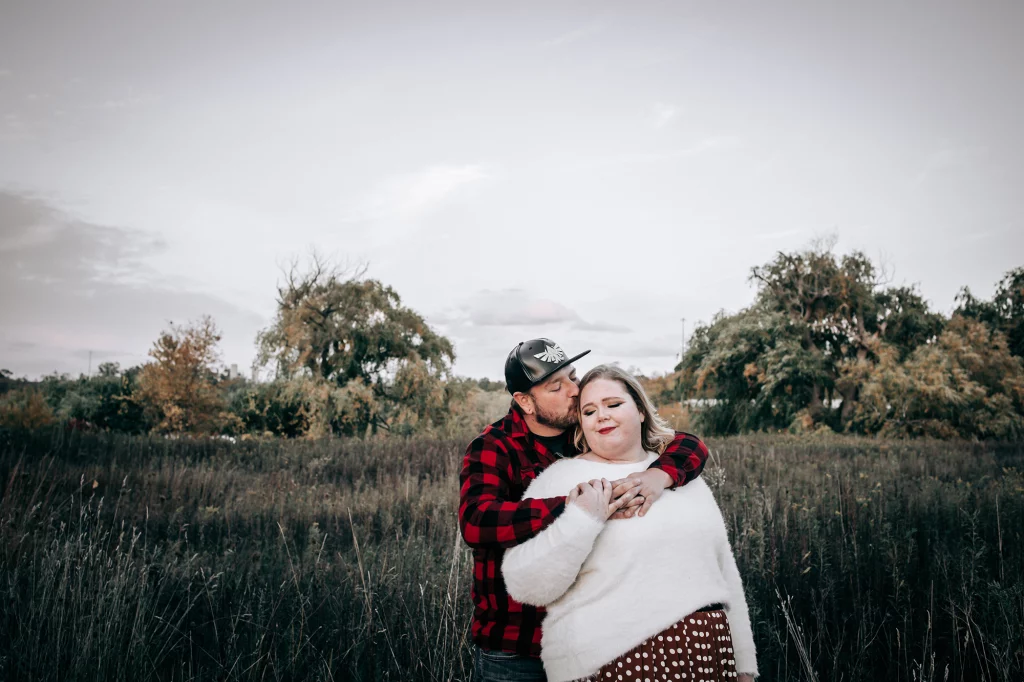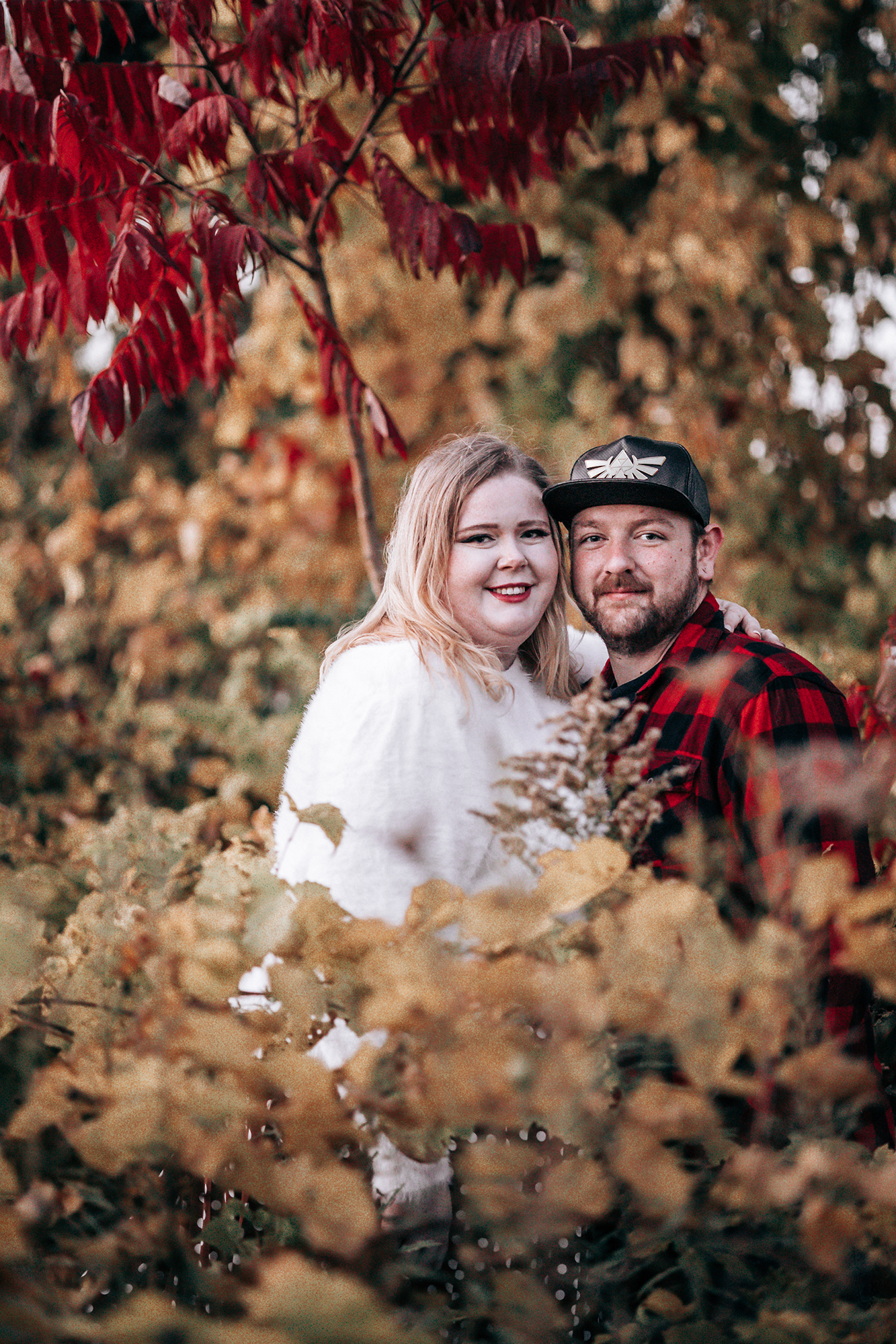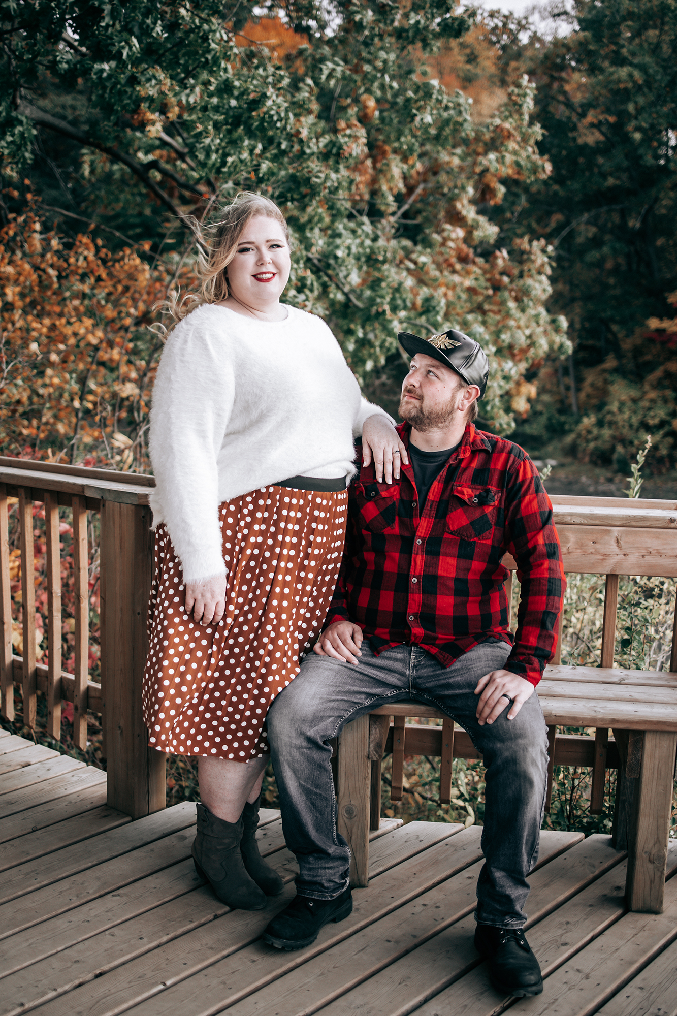 Their session took place in the fall, when the forest was glowing with golden leaves and warm sunset colours. Golden light filtered through the trees, the water reflected the sky, and the quiet trails created the perfect setting for capturing natural moments between two people deeply in love.